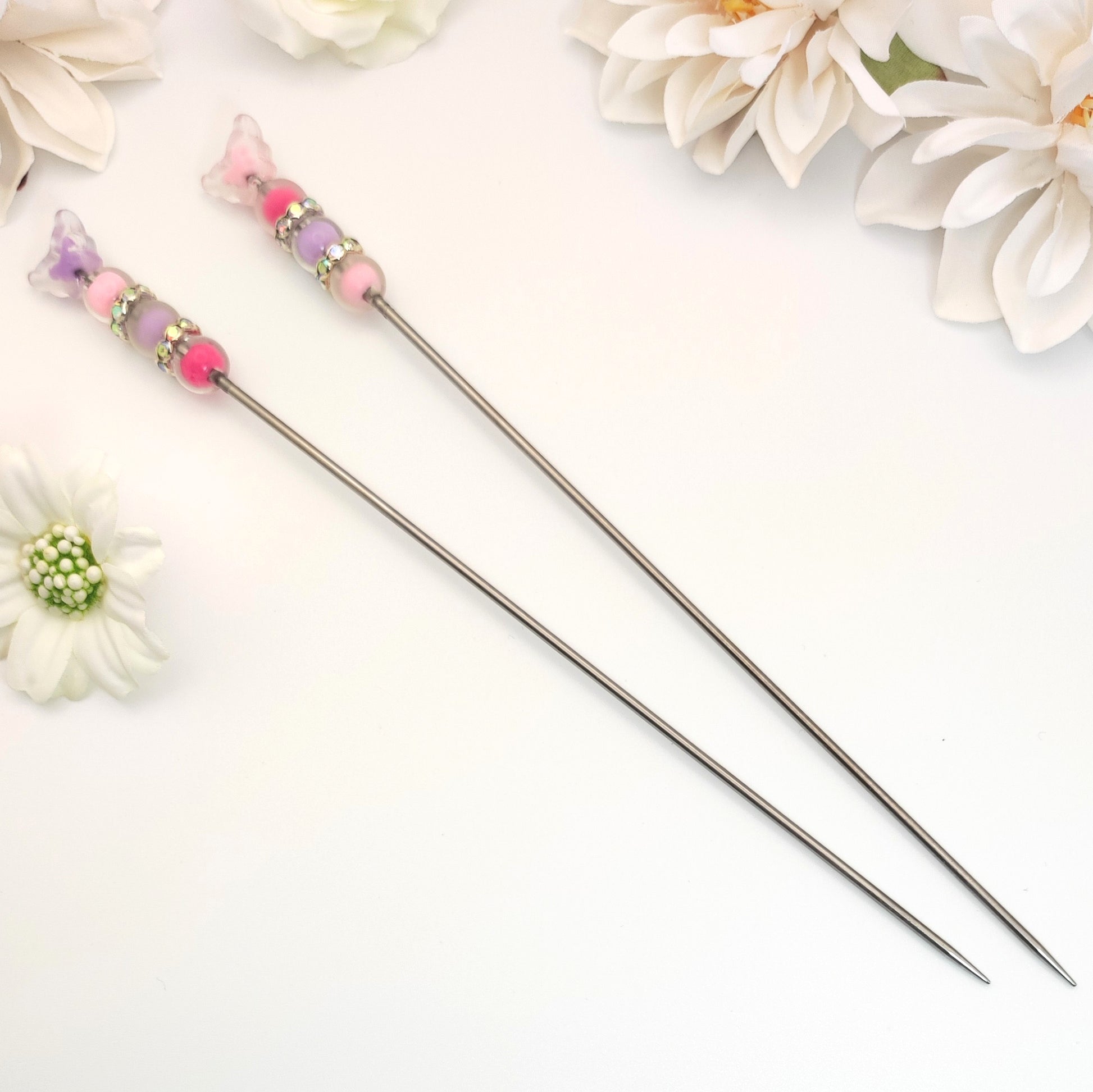 Die Stäbchen bestehen aus Edelstahl und sind ca. 20 cm lang. Am oberen Ende ziert sie ein süßer Schmetterling, kombiniert mit drei hübschen Perlen, die von funkelnden Abstandsringen eingerahmt sind. Ein echter Hingucker beim Häkeln – praktisch UND hübsch! 🌸💫