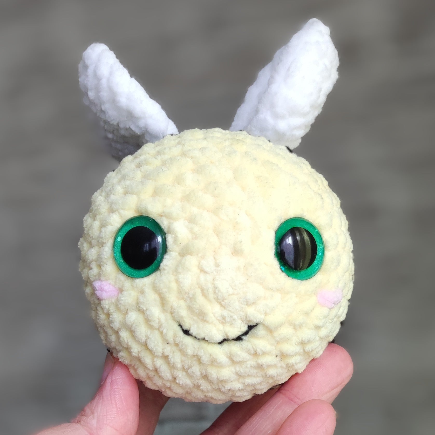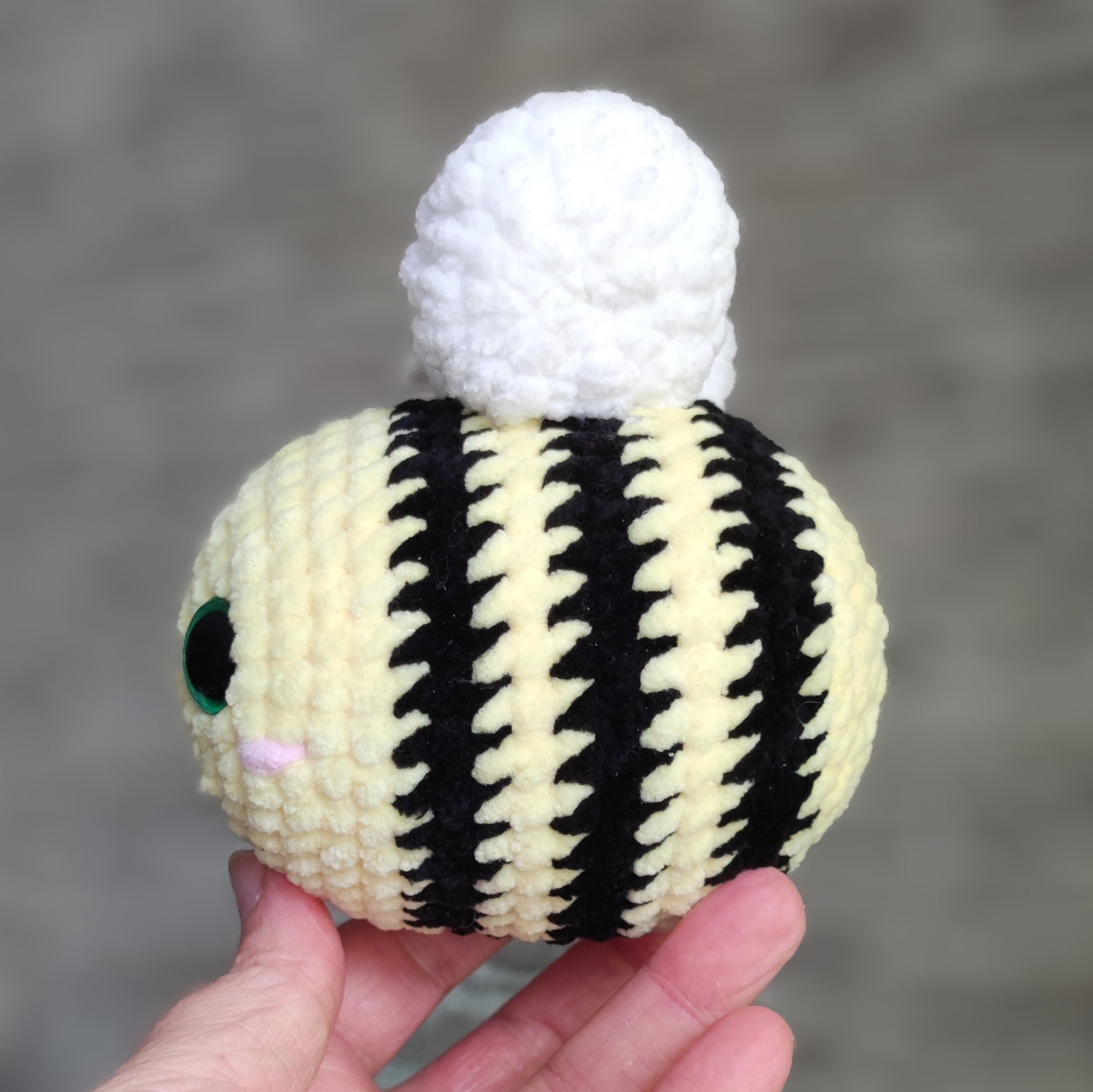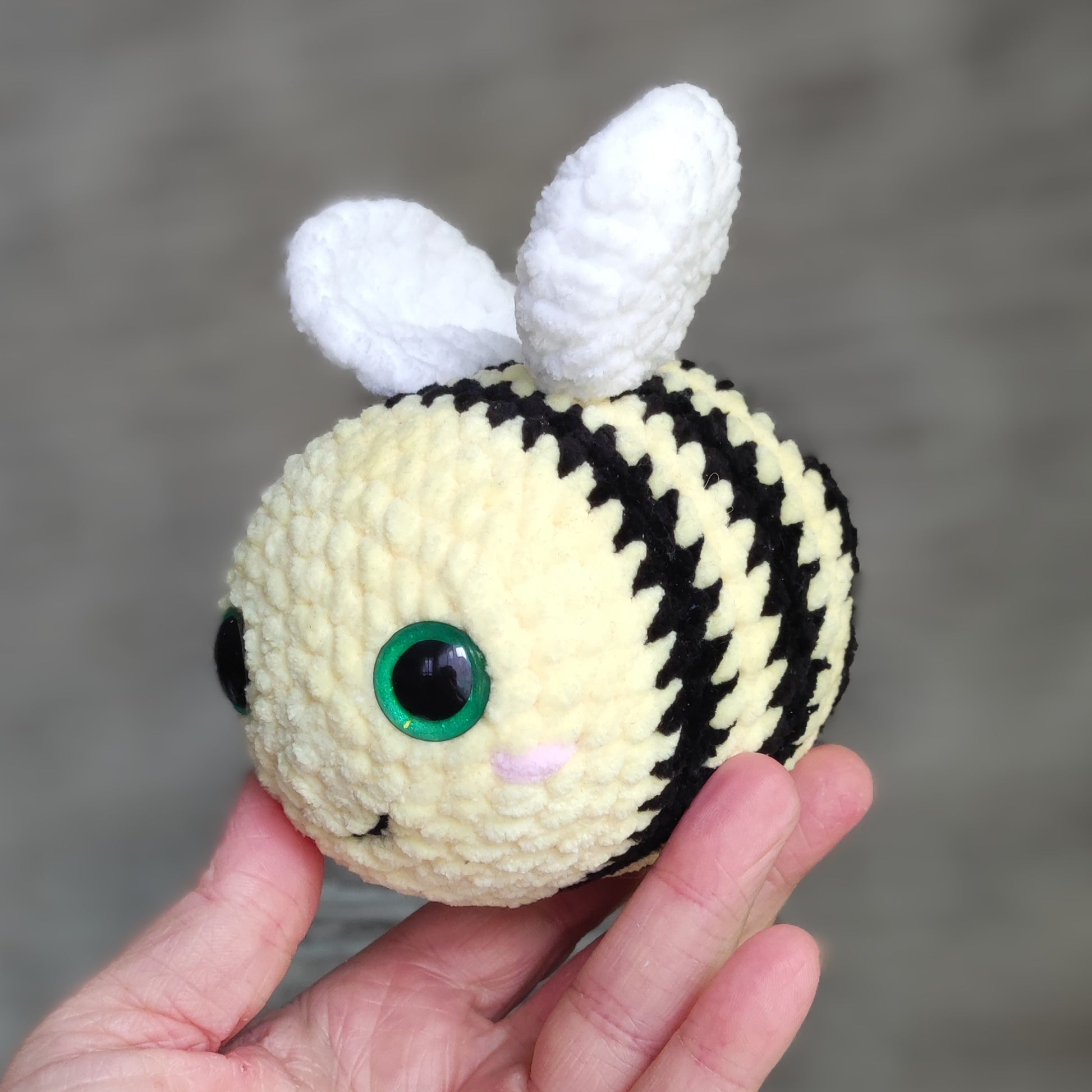 Dieses fröhliche Bienchen hat von mir handbemalte Sicherheitsaugen und ist ein liebevoll handgefertigtes Unikat.