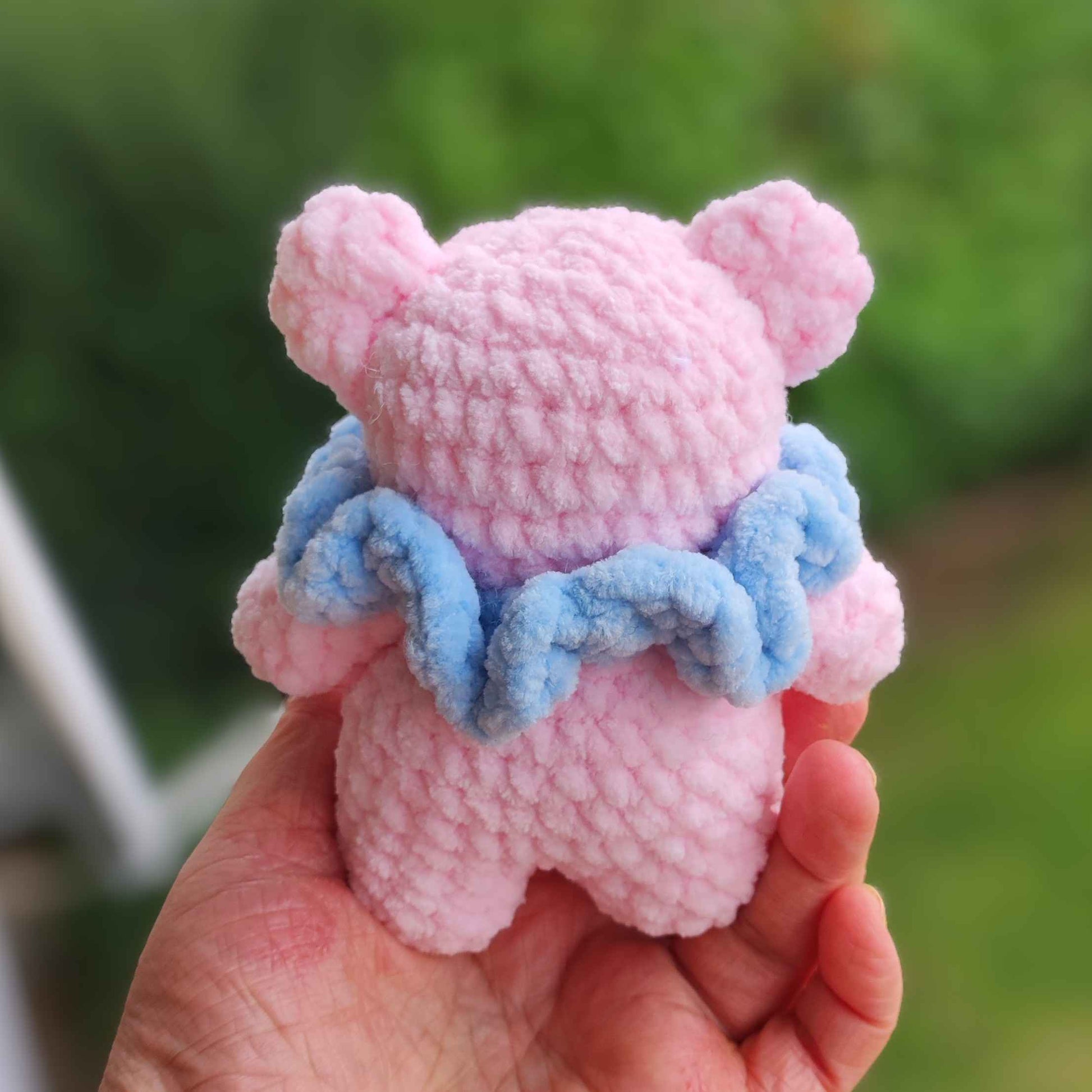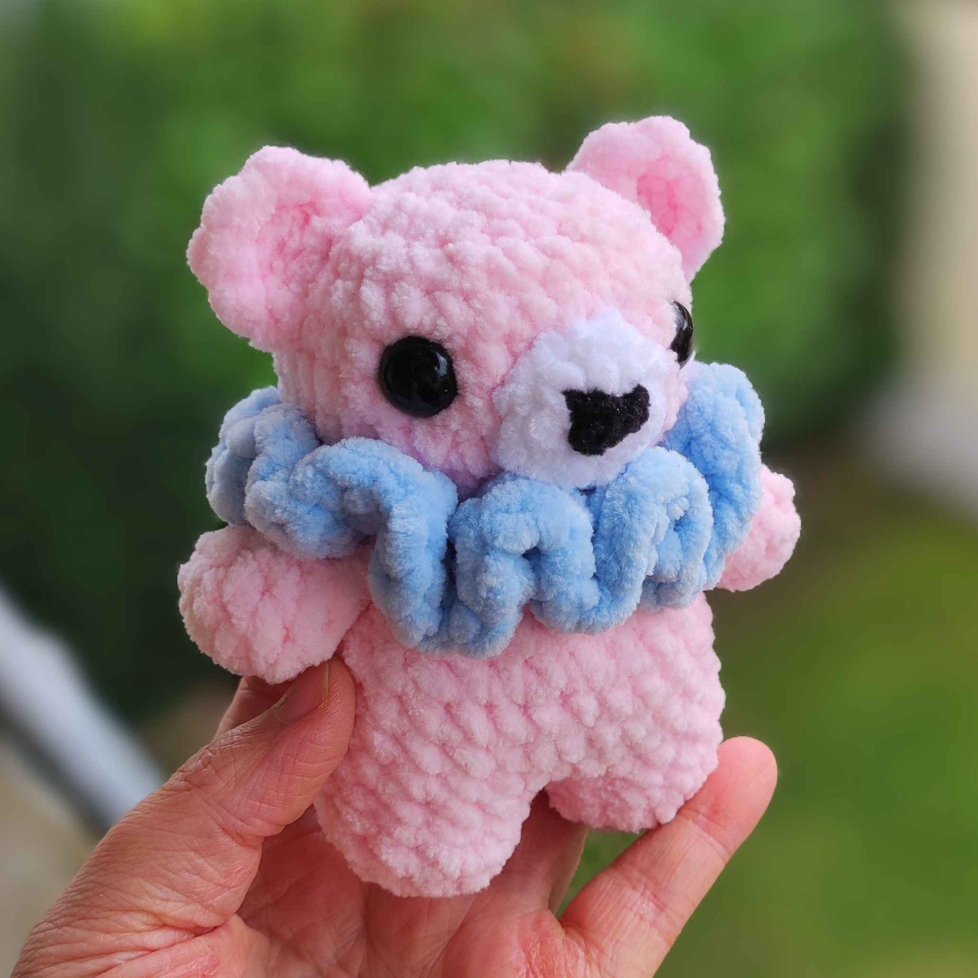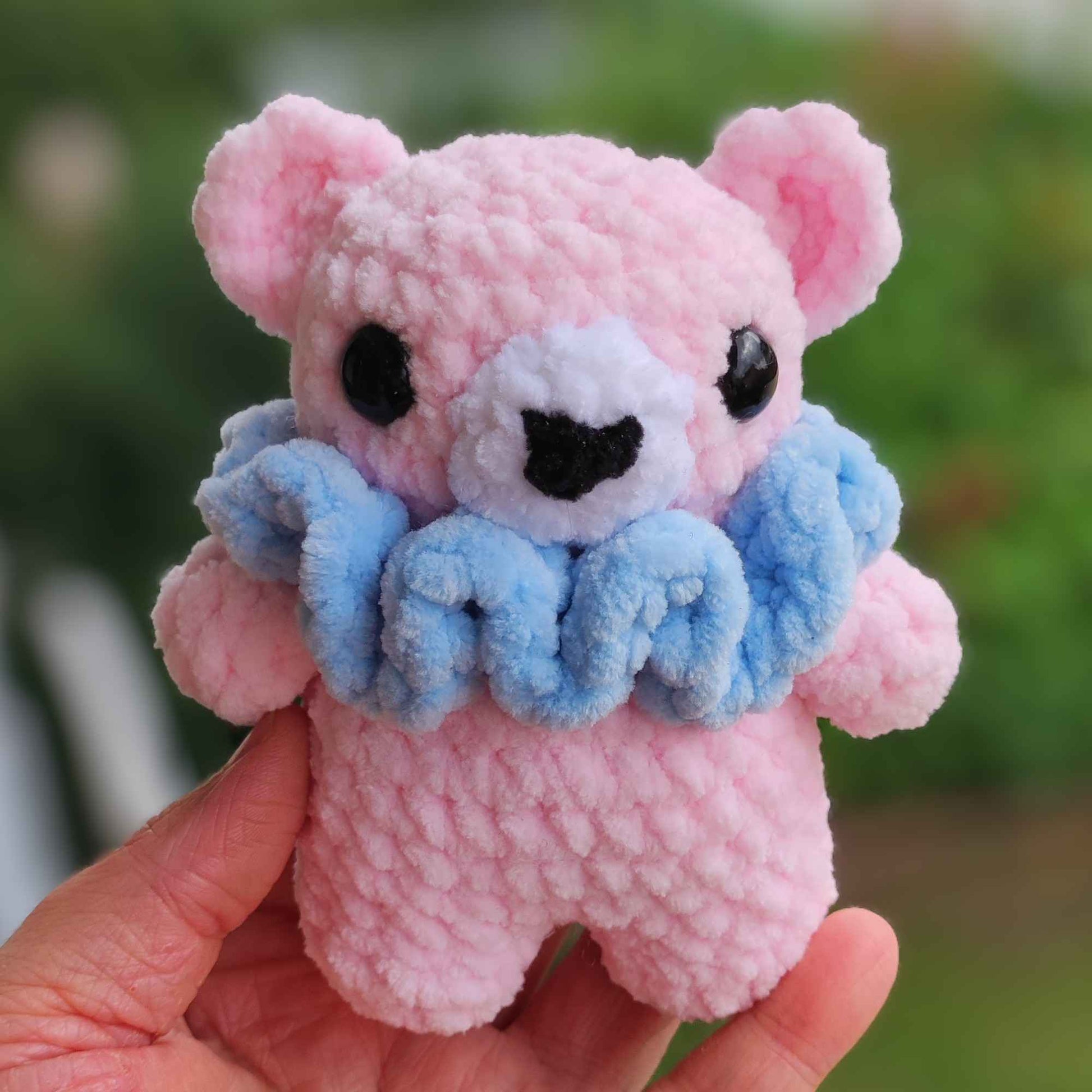 Dieses süße Bärchen trägt eine Halskrause und hat schwarze Sicherheitsaugen – jedes Exemplar ist ein liebevoll handgefertigtes Unikat.